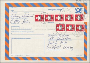 5 Mk. Flugpost per acht als seltene hohe Mehrfach-Frankatur auf nur kurzzeitig möglichem "Datapost-Inland"-Brief von Berlin 1990 nach Leipzig