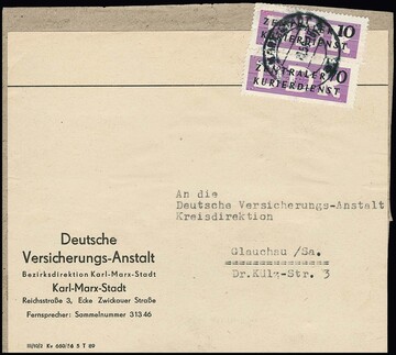 Dienst C, ZKD, 10 Pfg. (kleine Knitter, da über Adresse geklebt) und seltene 70 Pfg. auf Paketadresse 1956 aus Karl-Marx-Stadt