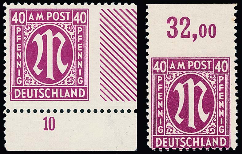 40 Pfg., zwei ungebrauchte Randstücke (einmal min. Gummipünktchen), oben bzw. rechts ungezähnt (Bogenecke re. unten)