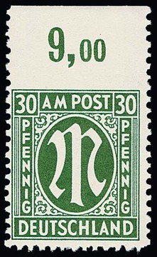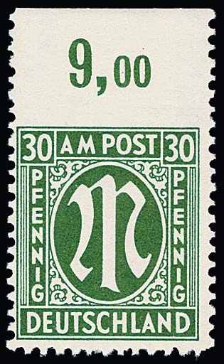 30 Pfg., Abart "oben ungezähnt" als ungebrauchtes Oberrandstück