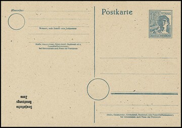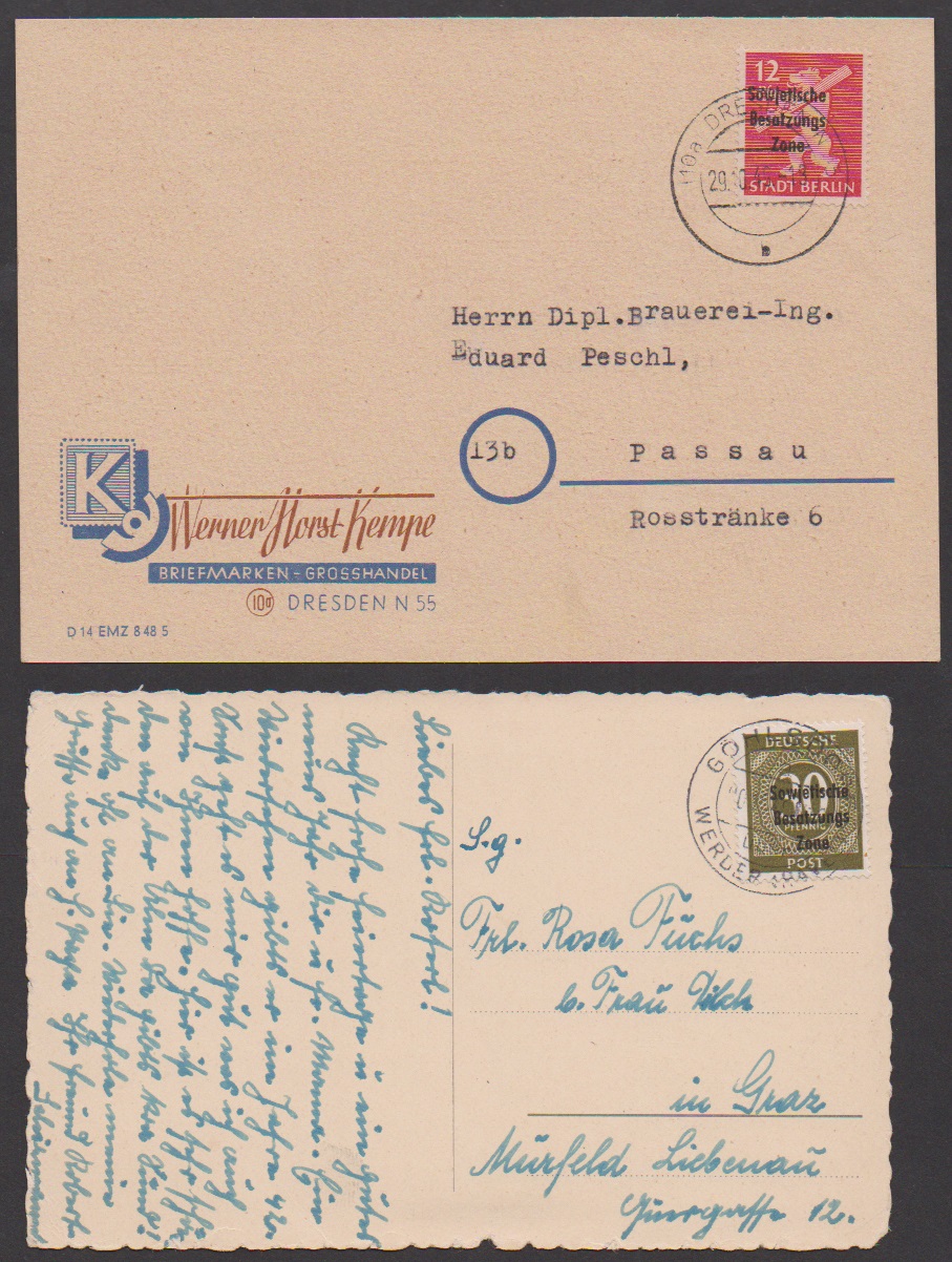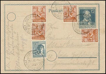10 Pfg. Maschinenaufdruck in 10-fach-MiF mit Ziffern 5 und 10 Pfg. auf seltener Ziffern-Ganzsachenkarte 5 Pfg. (P950) aus Orlamünde, sowie zweite Karte Ost-Verwendung Kontrollrat, P965 mit 12 u. 24(4) Pfg. Arbeiter aus Holzhausen
