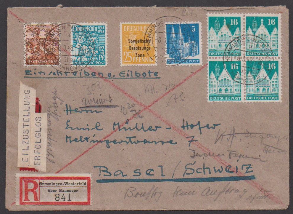 25 Pfg. Maschinen-Aufdruck vollständig als Westporto akzeptiert, nebst Bizone Nr. 44II, 70, 75 und Viererblock Nr. 83 auf portoger. Auslands-R-Expreßbrief von Hemmingen-Westerfeld, 8.9.48 in die Schweiz, dort Etikette "Eilzustellung erfolglos"