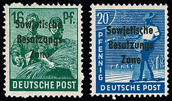16 Pfg. schwärzlichopalgrün (ein kurzer Zahn) und 20 Pfg. grünlichblau (typische Bogen-Druckstellen), beide guten Farben je postfrisch, Fotoexp. Paul. Mi. 700,-
