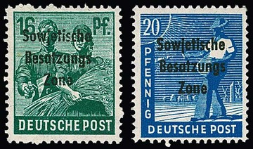 30 Pfg. Ziffern mit Aufdruckfehler I, sowie 16 Pfg. Köpfe I mit Plattenfehler I, je gest. (letztere zusätzlich unten Stiftspur), sign. Weigelt bzw. Fotoexp. Ruscher. Mi. 380,-