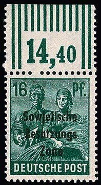 16 Pfg. Maschinenaufdruck, gute Farbe "schwärzlichopalgrün" als tadellos postfrisches Walzendruck-Oberrandstück, neues Attest Ruscher. Mi. 1300,-