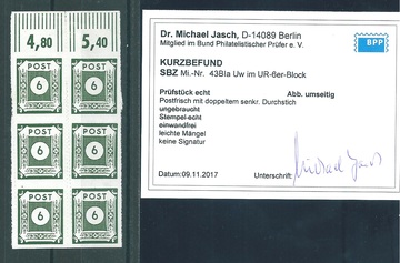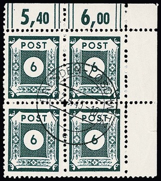 6 Pfg. schwarzblaugrün mit Postmeisterzähnung "Coswig", L11 1/2, im zentrisch gestempelten Eckrand-Viererblock oben rechts, sauber entwertet "Dresden-Loschwitz 22.9.45", rechte obere Marke zusätzlich mit Plattenfehler VI, im Zwischenraum gefaltet, die Marken tadellos. Fotoattest Dr. Jasch "echt und einwandfrei". Mi. der losen Marken bereits 2000,- ++