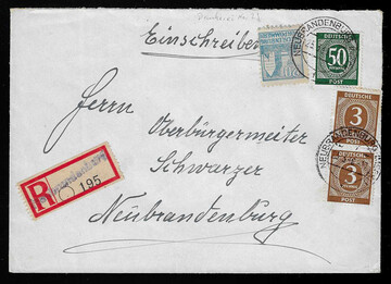 MVP, drei Briefe mit MiF: Nr. 38yb mit Nr. 1(2) auf Drucksache der 4. Gewichtsstufe, ferner Nr. 38y in MiF auf Orts-R-Brief, sowie Nr. 37-39y nebst Nr. 14 u. 19 auf R-Brief (etwas getönt)