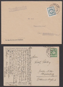 Ost-Sachsen, vier bessere Belege: 5 Pfg. Ziffern auf Ortskarte, 4 Pfg. auf Drucksache, sowie zweimal 6 Pfg. Wiederaufbau (einmal PF II) je als Einzelfrankatur auf Postkarte, zwei sign. Ströh. Mi. 610,- + PF