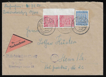 10 Pfg. geschnitten, nebst Randpaar 1 Pfg., auf portogerechtem Brief aus Magdeburg, 12.2.46, Mi. 500,-