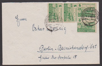 6 Pfg. Bodenreform, vier Werte mit Postmeister-Zähnung von Wittenberg, einer kl. Fehler, auf Bedarfsbrief aus Wittenberg, 7.3.46, Fotoexp. Schulz