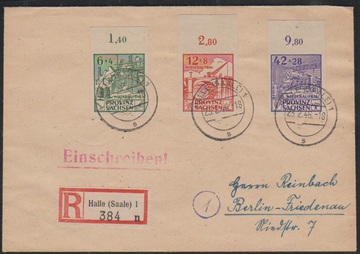 Wiederaufbau, geschnittene Oberrandserie auf R-Brief aus Halle, sign. Ströh. Mi. lose 180,-