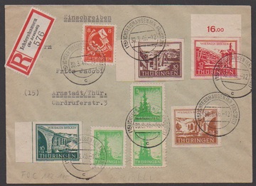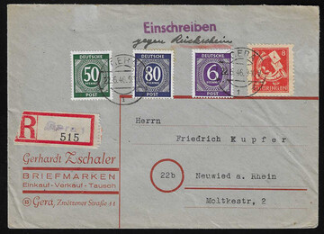 8 Pfg. (ein Fehlzahn) nebst Kontrollrat 6, 50 u. 80 Pfg. als gute Portostufe auf R-Brief gg. Rsch. aus Gera, 22.6.46