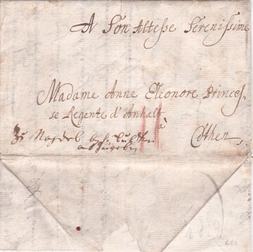 "Brüssel", 1687, kleiner Adelsbrief an "Madame Anne Eleonore, Princesse Regente d` Anhalt à Cöthen", hs. Forwarded-Vermerk "zu Magdeburg bei H. Buchsten abzugeben"