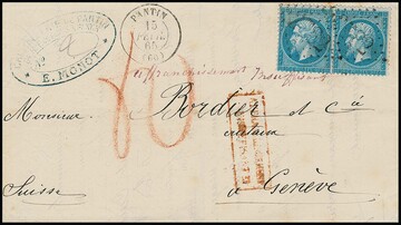 Zwei Briefe in die Schweiz, 1864 von Lyon mit 40 C. orange nach St. Gallen, sowie 1865 von Pantin mit zweimal 20 C. blau nach Genf, roter Ra2 "Affranchissement insuffisant" und mit 80 Rp. nachtaxiert