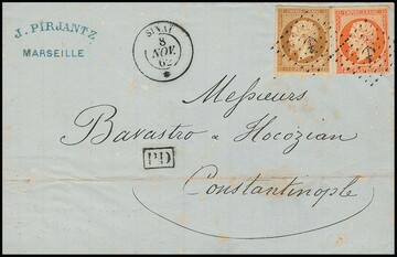 Zwei Briefe (min. Mgl.) je nach Ägypten: 1868 von Straßburg mit Paar 20 C. blau nach Kairo, sowie 1869 von Paris mit 40 C. orange nach Alexandria