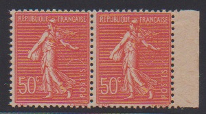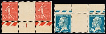 50 C. Säerin und 1,50 Fr. Pasteur, sog. "Marseille-Fälschungen" zum Schaden der Post in postfrischen Paaren vom Rand, Michel nicht gelistet, Attest Pieles