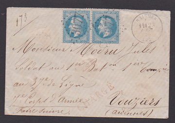 20 C. blau einzeln auf Couvert aus Aug. 1870 an einen Angehörigen der Armee du Rhin in Metz (noch nicht deutsch besetzt), sowie im Paar auf Chargécouvert v. 27.8.70 an einen Soldaten, von Raismes in Vouziers