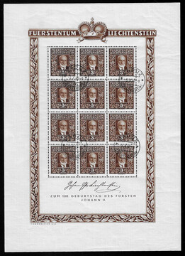 3 Fr. Fürst Johann im kpl. Kleinbogen (unbed. Randtönung) mit EST. Mi. 500,-