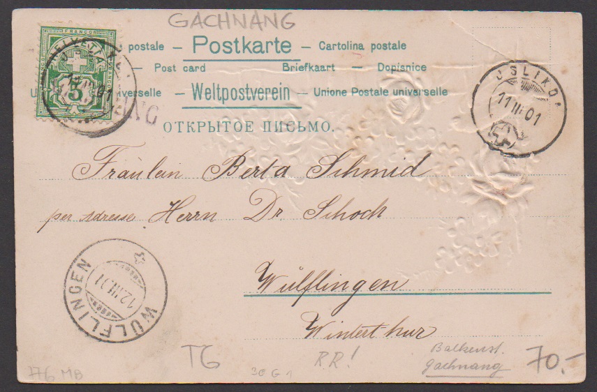 "Gachnang", seltener violettschwarzer L1, nebst K2 "Islikon", auf Brief 1884, sowie auf Postkarte mit 5 C. 1901 (30)