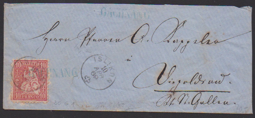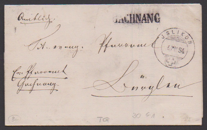 "Gachnang", seltener blauer L1, nebst K1 "Islikon", auf kleinem Brief mit 10 C. rosa, etwas fleckig (30)