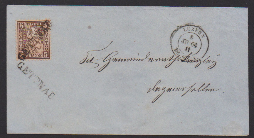 "Gettnau", L1 als Entwertung, K2 "Luzern" nebengesetzt, auf Couvert 1864 mit 5 C. braun (30)