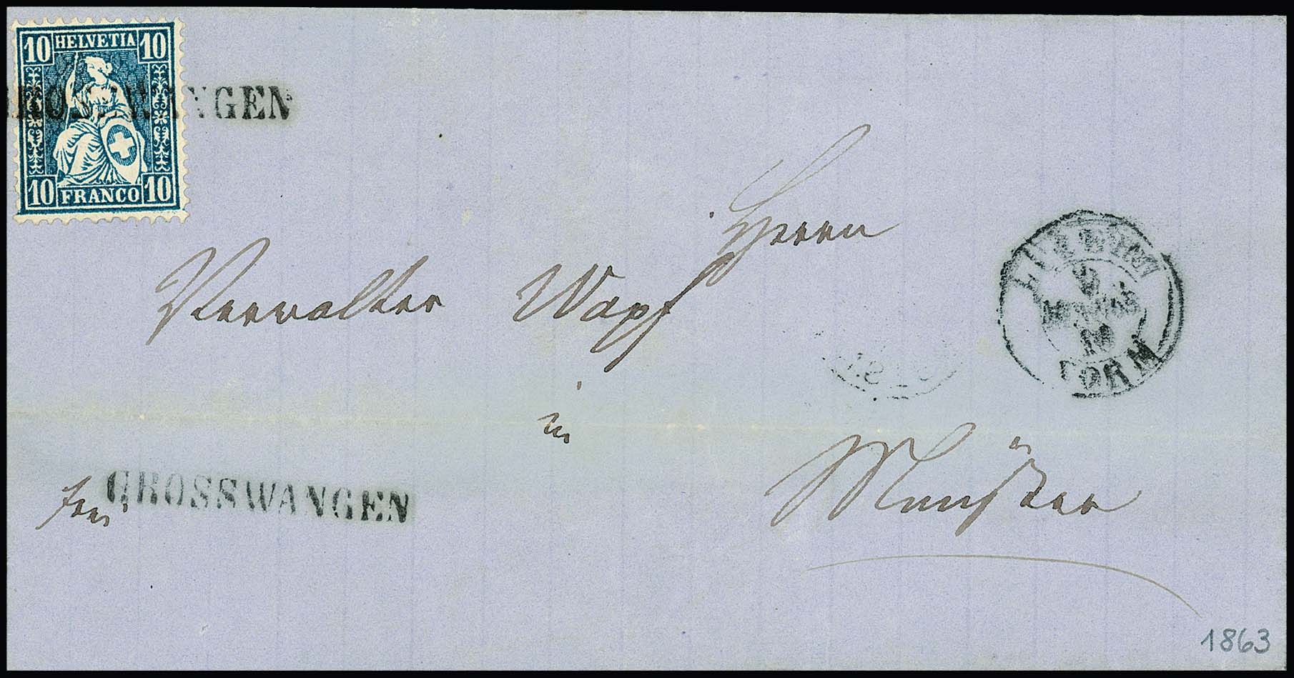 "Grosswangen", klarer L1, K2 von Luzern nebensetzt, auf Faltbrief 1863 mit normal gez. 10 C. blau (30)