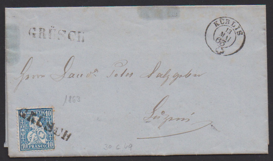 "Grüsch", L1 als Markenentwertung, K2 "Küblis" nebengesetzt, auf Brief 1863 mit 10 C. blau, kl. Mgl. (30)