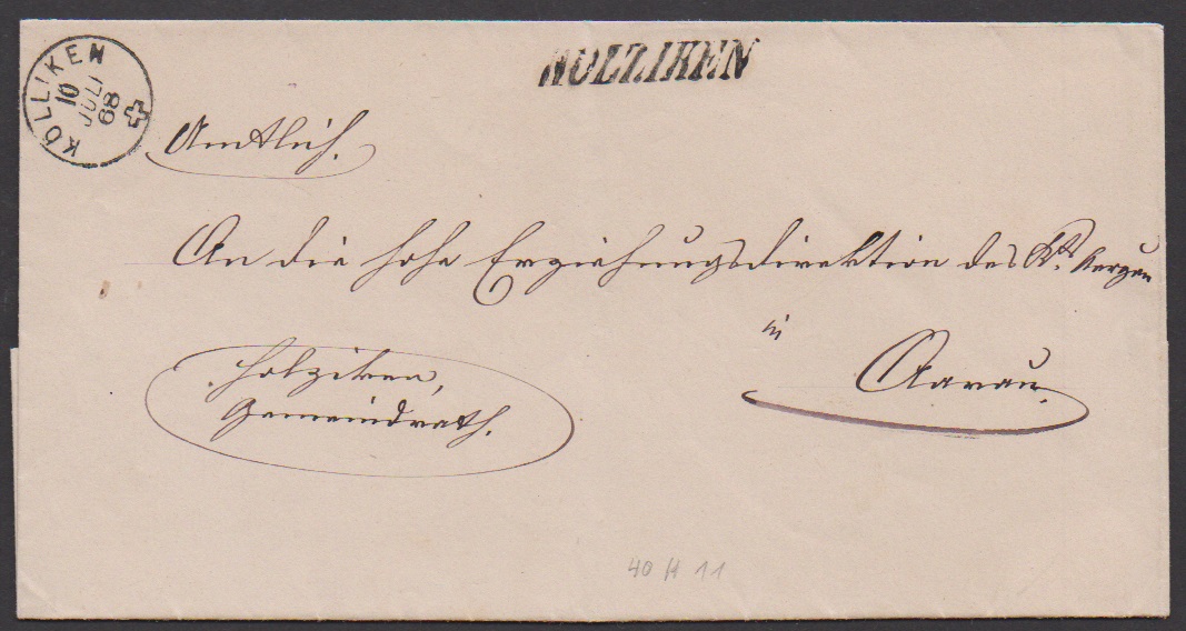 "Holziken", Schrägschrift-L1, nebst K1 "Kolliken", auf Brief 1868 (40)