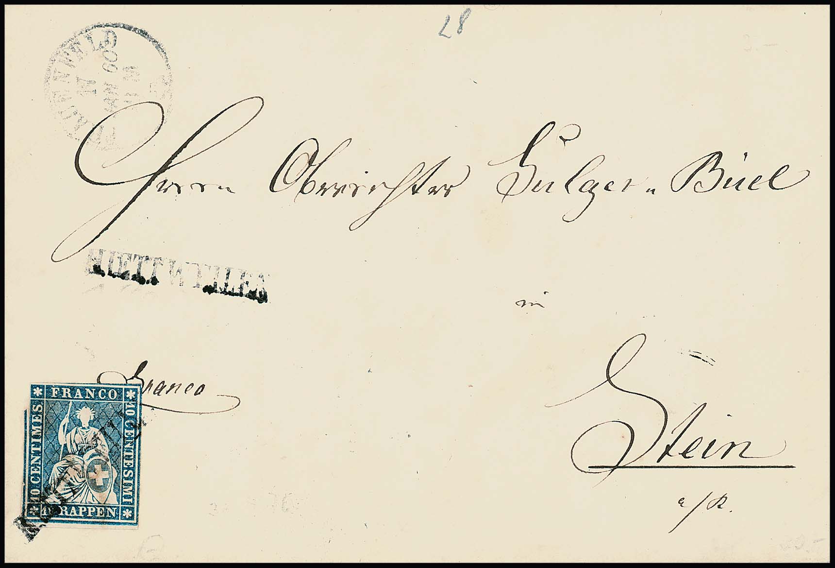 "Huettweilen", L1 als Entwertung, K1 "Frauenfeld" nebengesetzt, auf Strubel-Brief mit 10 Rp. blau (Schnittfehler) 1860 (30)