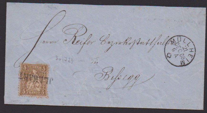 "Illhart", seltener L1 als Entwertung, K1 "Müllheim" nebengesetzt, auf Brief 1868 mit 5 C. braun (ein Zahn) (30)