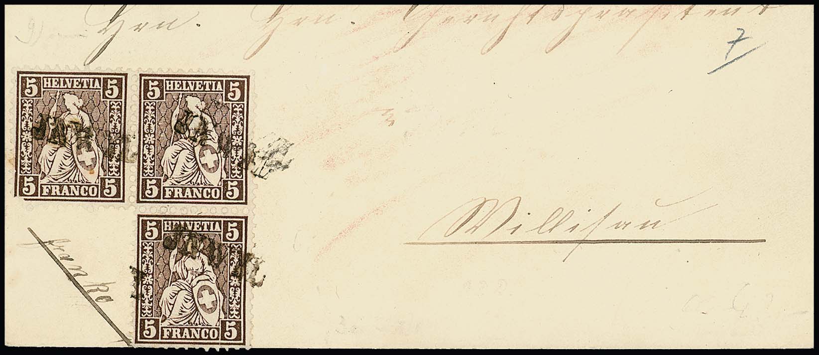 "Inwil", besserer L1 auf Brief (oben etwas verkützt, Marken kl. Mgl.) mit Dreierblock 5 C. braun (30)