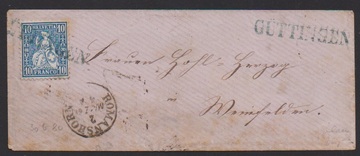"Güttingen", seltener blauer L1 als Markenentwertung, K1 "Romanshorn" nebengesetzt, auf Damencouvert (fleckig) mit 10 C. blau (30)