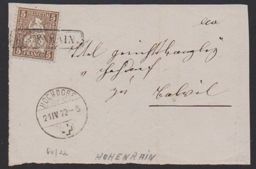 "Hohenhain", Stab-Ra1 als Entwertung, Nebenstempel "Hochdorf", auf Briefvs. 1872 mit 5 C. braun (64)