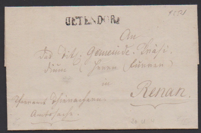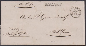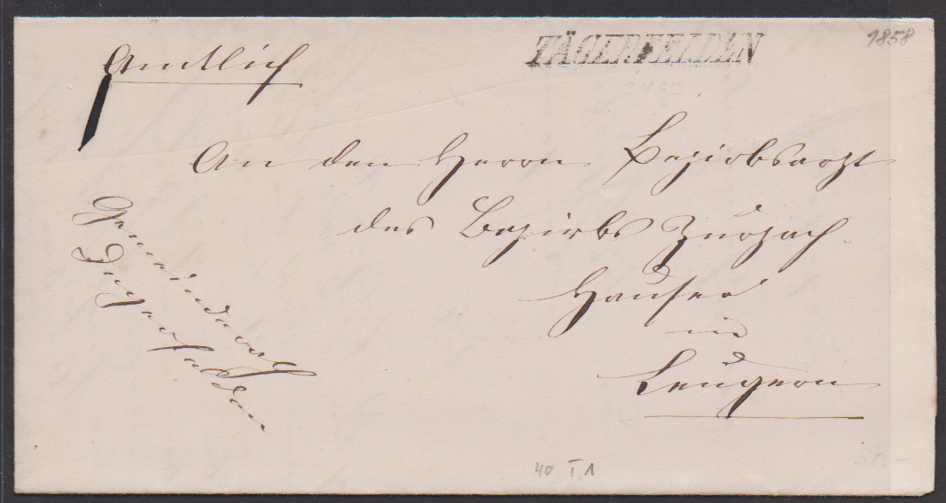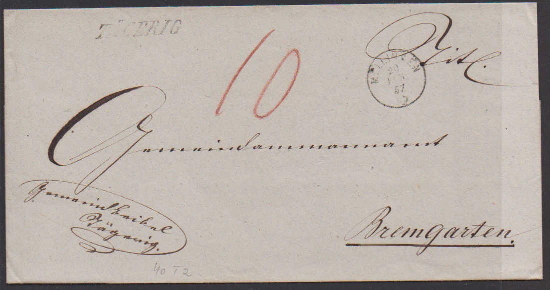 "Tägerig", Schrägschrift-L1 nebst K1 "Millingen" auf Brief 1857 (40)