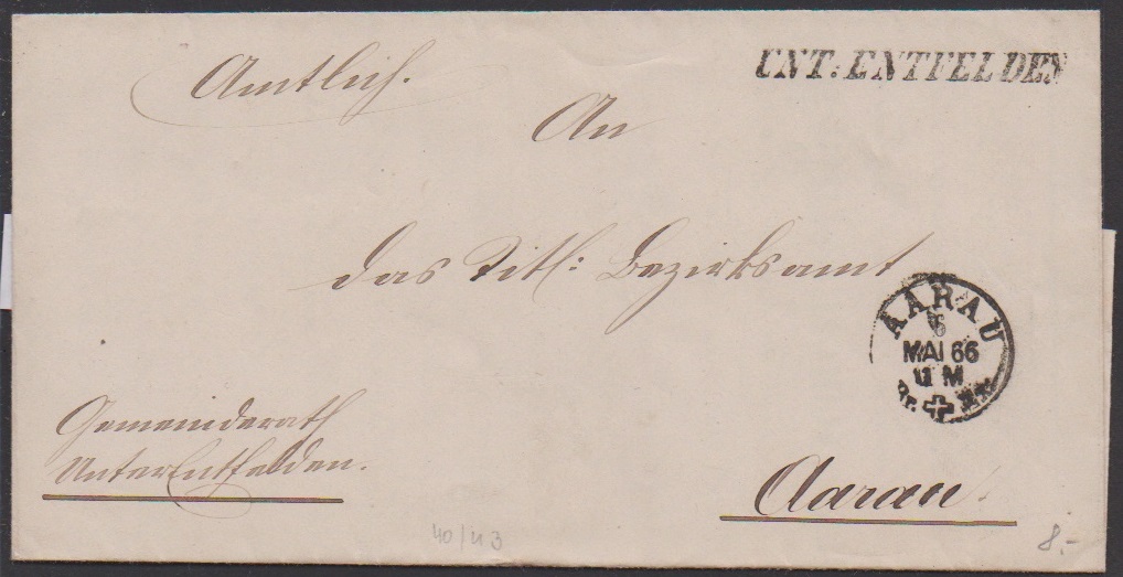 "Unt. Entfelden", Schrägschrift-L1 nebst K1 "Aarau" auf Brief 1866 (40)