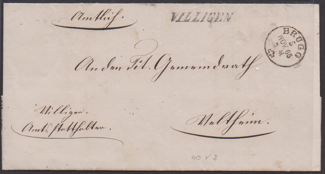 "Villigen", Schrägschrift-L1 nebst K1 "Brugg" auf Brief 1865 (40)