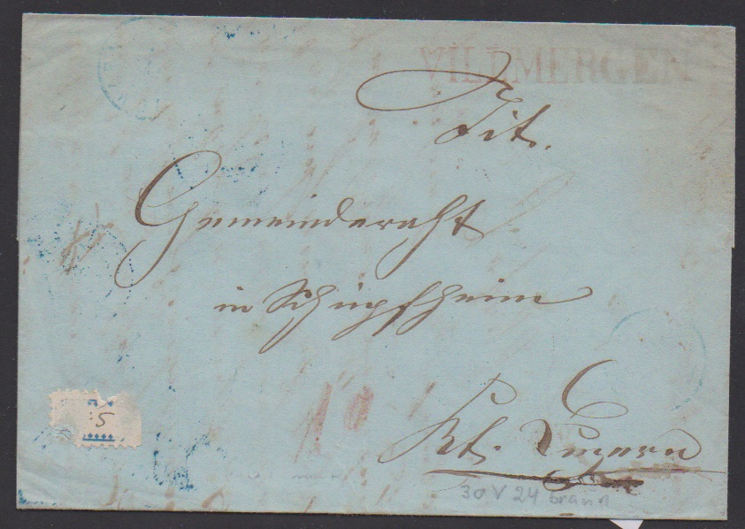 "Villmergen", besserer roter L1 auf Faltbrief (vs. kl. Etikettenreste) 1854 (30)