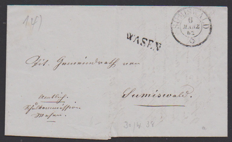 "Wasen", besserer L1 und K2 "Sumiswald" auf Briefchen (kl. Einriß unten) 1862 (30)