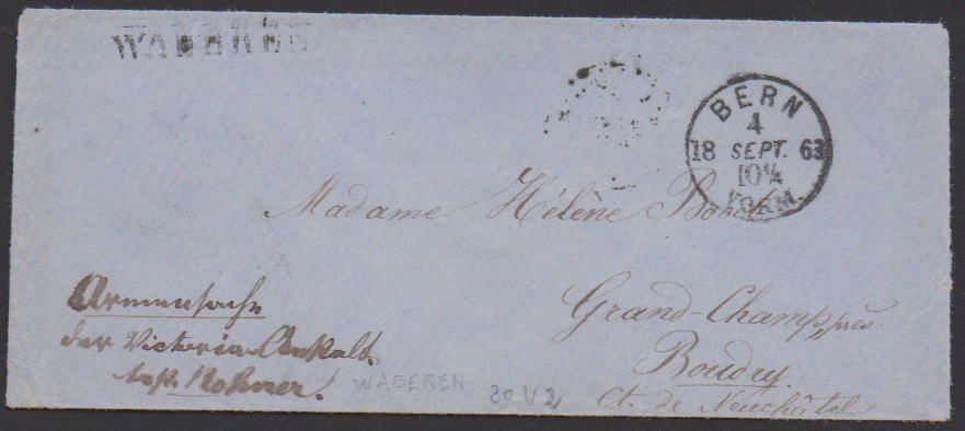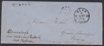 "Waberen", besserer L1, nebst K1 "Bern", auf Couvert 1863 (30)