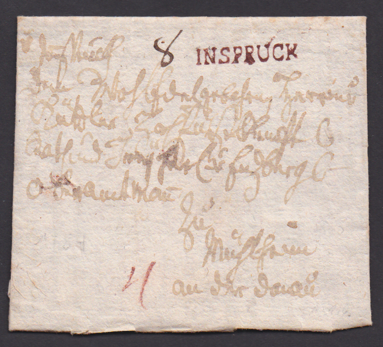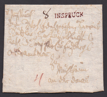 "Innsbruck", 1784, klarer roter L1 "INSPRUCK" auf Brief nach Mühlheim a.d. Donau