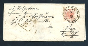 "Kuttenberg", Böhmen-K1 mit Verzierung, große Type, zentrisch auf Kabinett-Faltbrief (1857) mit 3 Kr. nach Prag