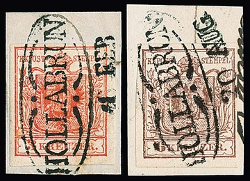 "Hollabrunn", je voller Zier-Ovalstempel, mit hinzugesetztem Datums-L1 auf zwei Kabinettbriefstücken 3 Kr. rosa bzw. 6 Kr. braun (diese Fotoexp. Ferchenbauer), Niederösterreich, Müller 1023a/192 P.