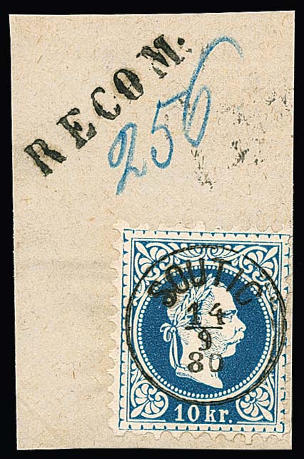 "Soutic", Böhmen-Fingerhut-K1 zentr. auf Briefstück 10 Kr. (1/2 Z.) mit L1 "Recom.", Befund Eichele