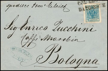"Triest", "Col Lloyd Da Trieste", L2 auf Kabinett-Faltbrief (1856) mit 9 Kr. aus Triest nach Bologna, Schiffsbrief