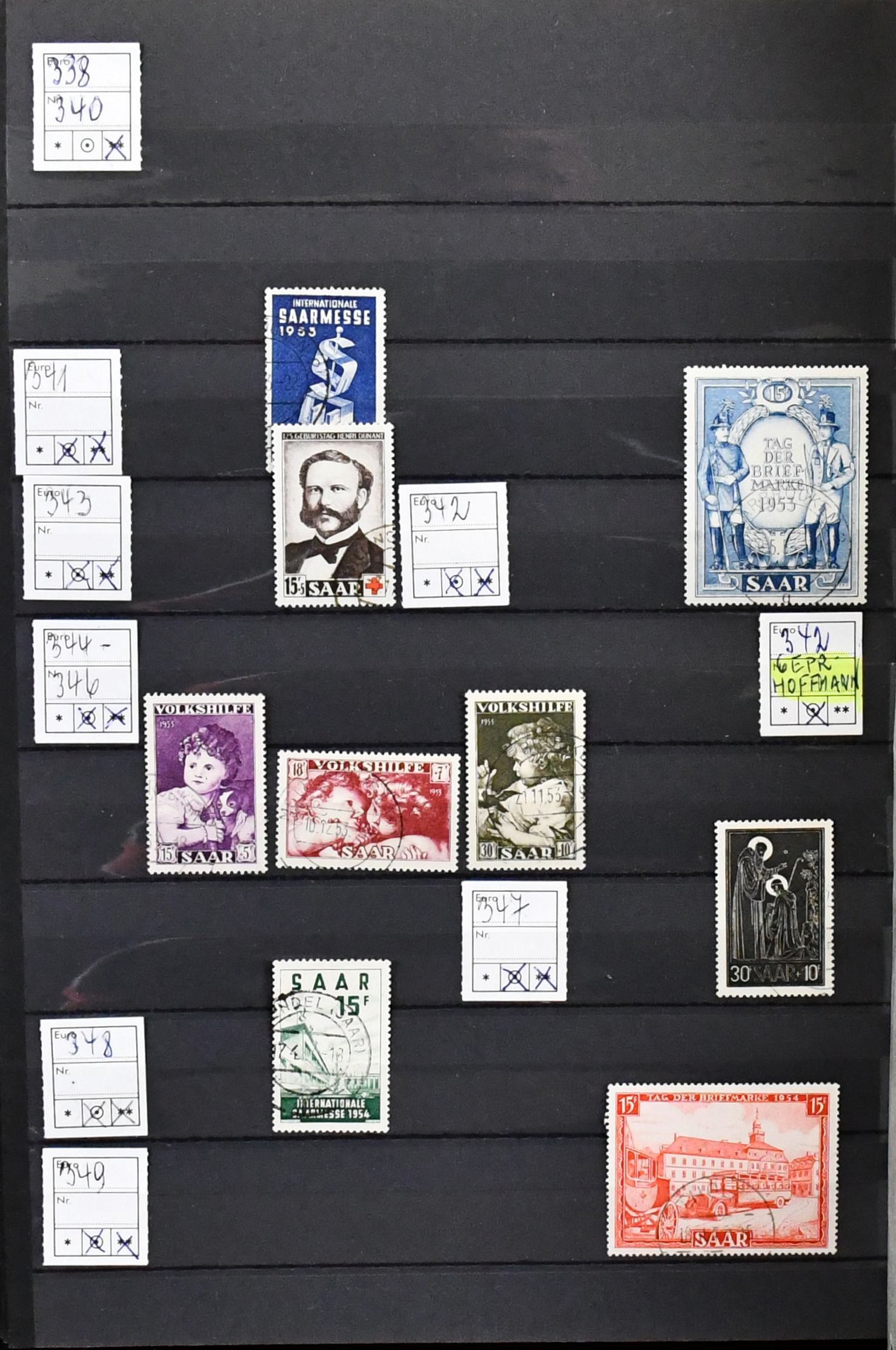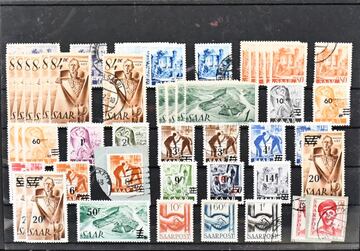 Saar, 1920/1959, Slg. ab erster Ausgabe, Schwerpunkt bei den Ausgaben nach 1947, im Lindner-T-Vordruckalbum. Dabei Nr. 226/54 gest., Volkshilfe 1951 postfr., Kleinbogen Nr. 351/53 postfr., OPD postfr. und gest. je kpl., inkl. Nr. 380 DZ "Kt" gest. usw. Mi. 1500,- plus gest. Hochwasserhilfe-Satz unberechnet