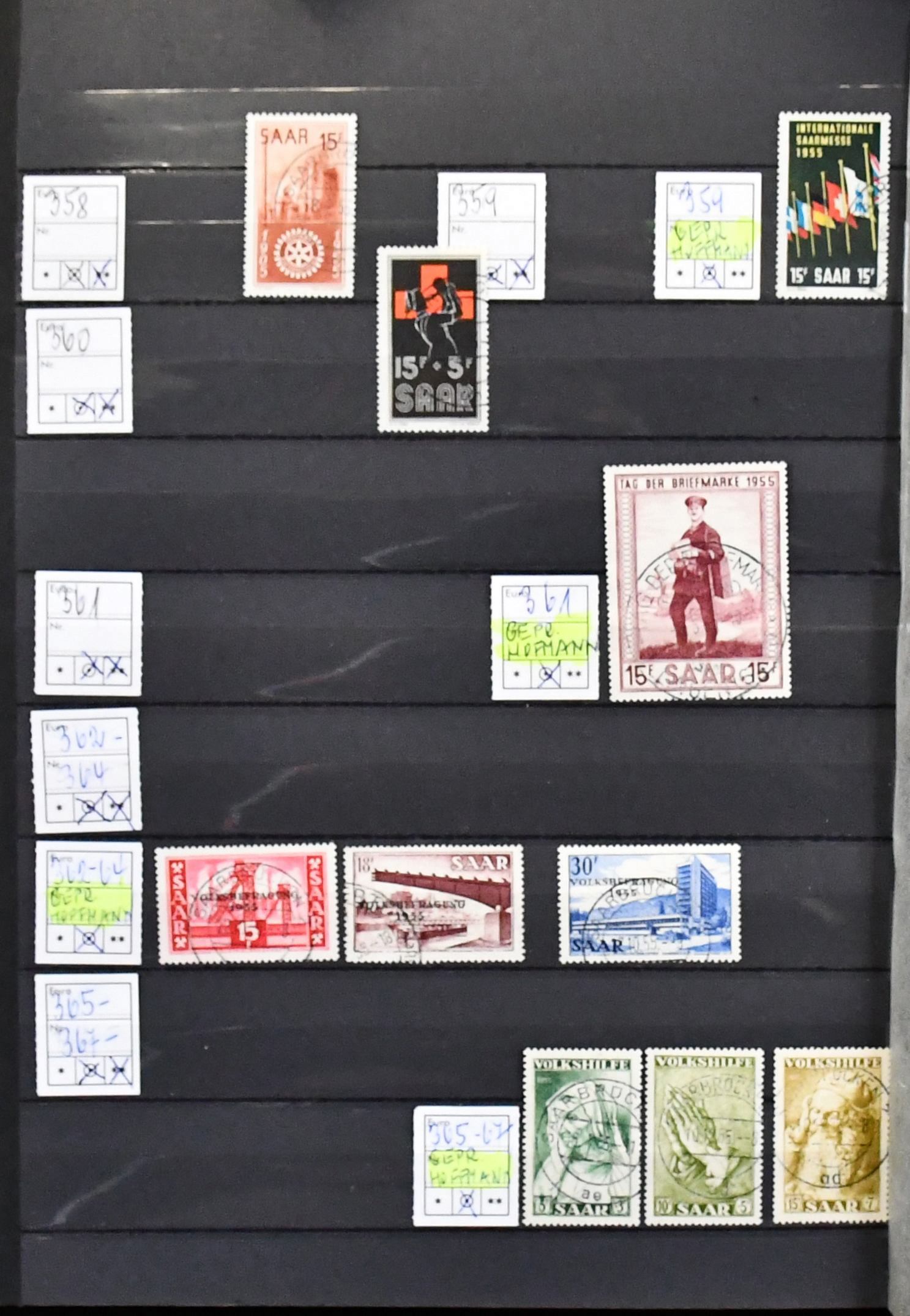 Saarland, 1947/59, sortenreiche Zusammenstellung vieler hundert Werte auf Steckkarten, dabei Nr. 252/54 gest., 314/16, beide Heuss-Sätze je per drei, usw.