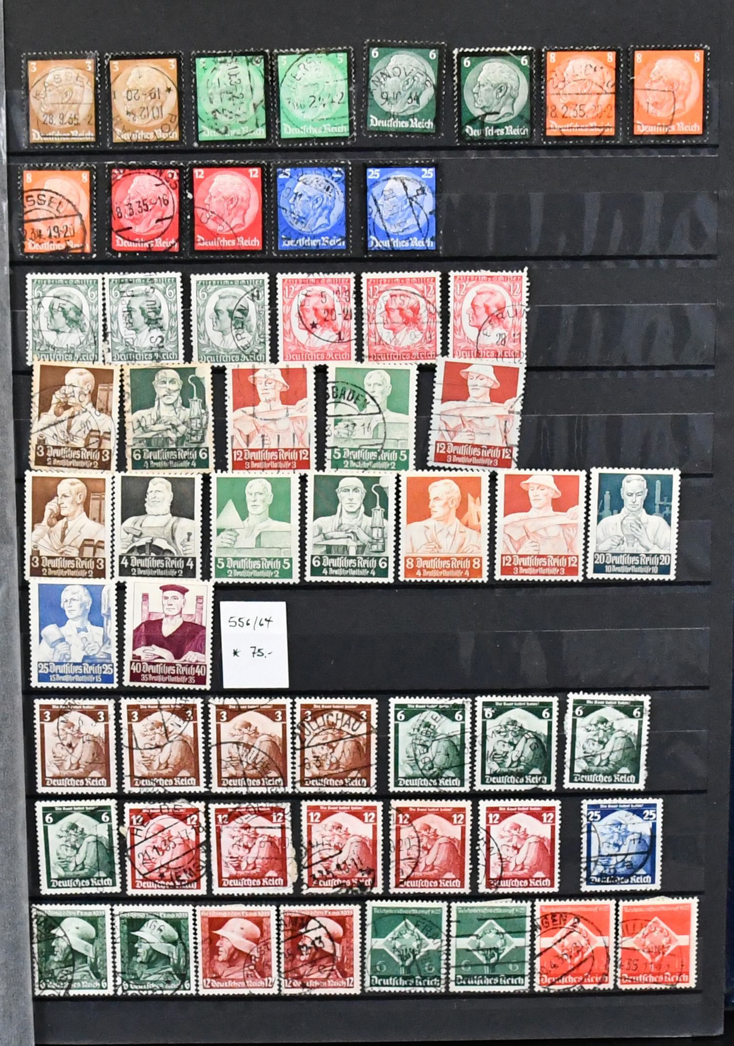 Deutsches Reich, 1872/1945, gestempelte Zusammenstellung ab den Brustschilden, mit meist III. Reich, im E-Buch. Dabei 1 u. 4 RM Zeppelin, Nothilfe 1933 in A- und B-Zähnung (Mi. 650,-), Nothilfe 1935 (Mi. 160,-), mehrere WHW-Sätze, Nr. 529/39 mehrf., 702/13, Bl. 11 usw. Dazu 1 RM Chicagofahrt nachgummiert. Mi. 7500,-, wovon alleine rund 4000,- auf das III. Reich entfallen