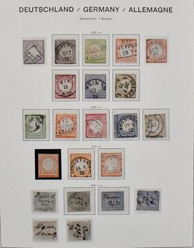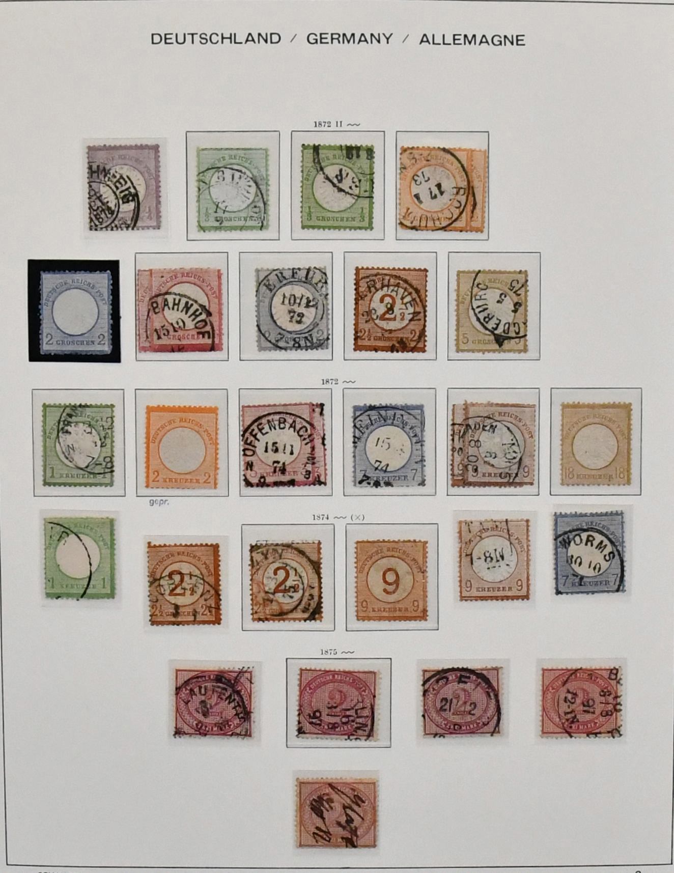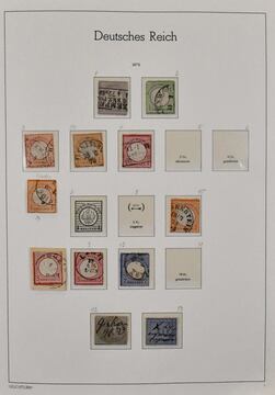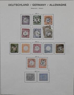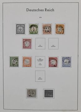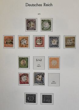Deutsches Reich, 1872/1932, bis auf wenige Ausnahmen, durchweg gestempelte Slg. im Leuchtturm-Vordruckalbum. Dabei umfangreicher Brustschildteil (Mi. alleine 7000,-, plus defekte gest. Nr. 24 unberechnet), u.a. mit Nr. 1/3, 12/13 mit Federzug, 14/15, 27a/b, seltener Nr. 28, 30, je gest., usw. Dazu reichhaltig die nachfolgenden Ausgaben, teils mit Farben, Nr. 66 gest. (Mi. billigst 500,-), Nr. 79, viel Infla, Weimar mit den meisten Nothilfe-Sätzen, Dienst ab Nr. 1/8, sowie einige Zusammendrucke, u.a. S8 gest. (Mi. billigst 200,-)