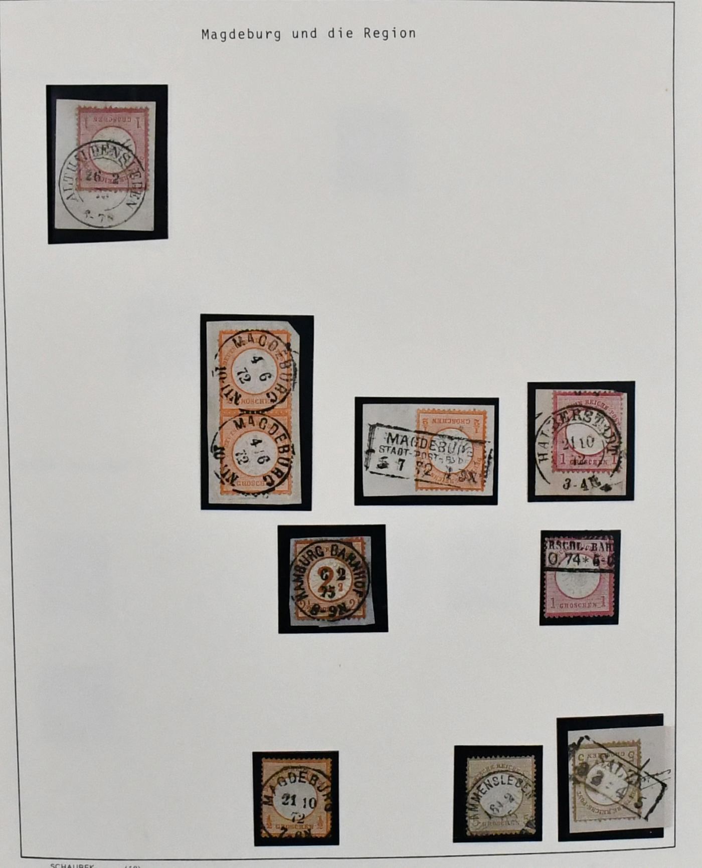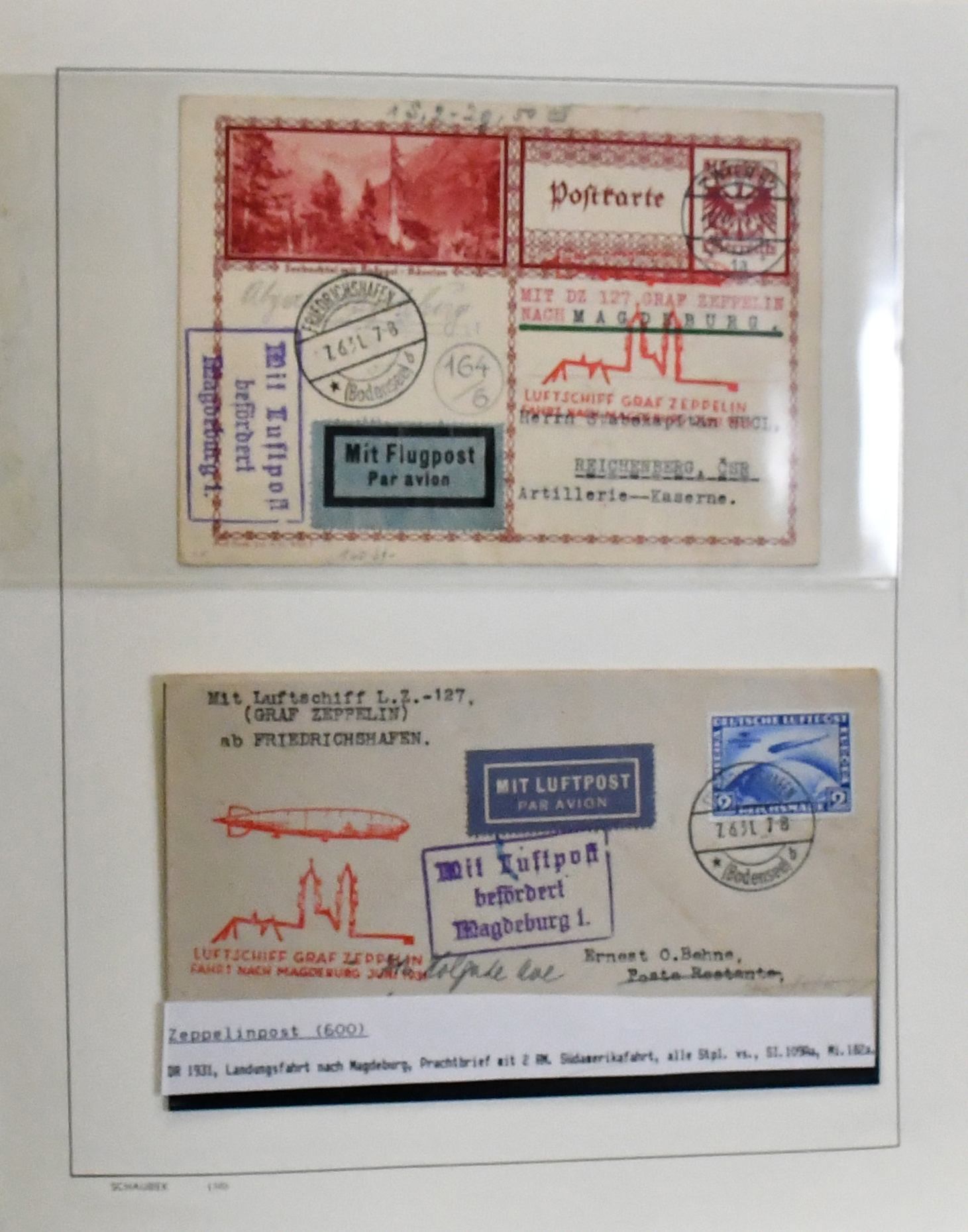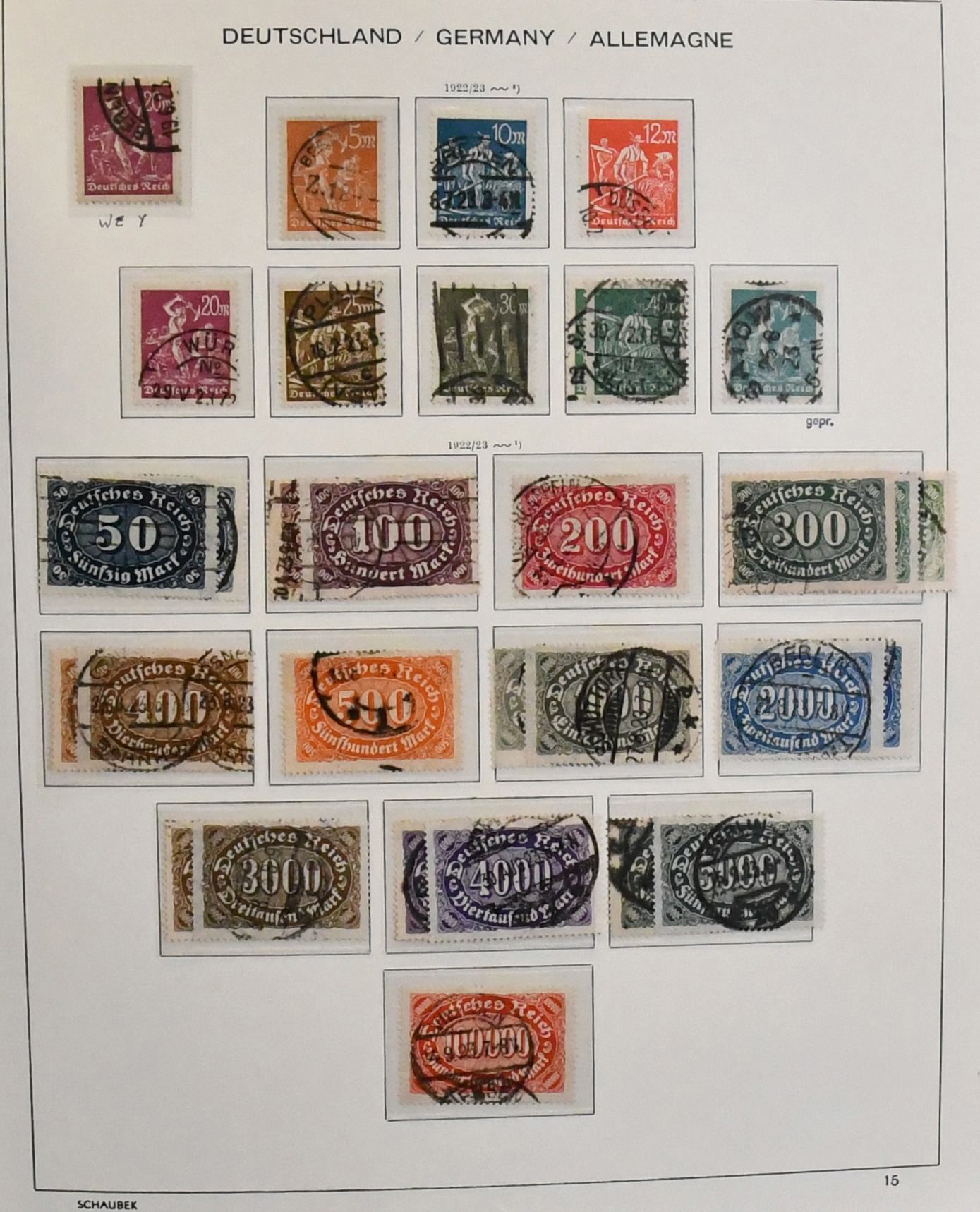 Deutsches Reich, 1872-1932, hochwertige Sammlung in beiden Erhaltungen im Schaubek-Vordruckalbum, beginnend mit einem guten Brustschildteil, u.a. mit Nr. 1-10 gest., 12(4), 13(2), 16-22, 24, 27(3) etc., zusätzlich mit Belegen, Einheiten und Stempeln, Germania sehr reichhaltig mit u.a. Nr. 66III, gepr. Jäschke, Infla mit vielen guten gest. und gepr. Werten, z.B. Nr. 178, 190, 245, 258-60, 330 usw., Weimar mit guten Ausgaben wie z.B. Nr. 401 postfr. vom Unterrand, 461-62 je auf Briefstück etc., ferner sieben Zeppelin-Belege, u.a. mit Freistempler der 3. SAF 1932, Zuleitungen Schweiz und Österreich, Nr. 438 auf Brief der Magdeburg-Fahrt 1931 usw. Generell mit vielen geprüften Stücken, sowie mit Einheiten, Randstücken, Belegen und Briefstücken aufgelockert. Völlig unberührtes Objekt mit Substanz