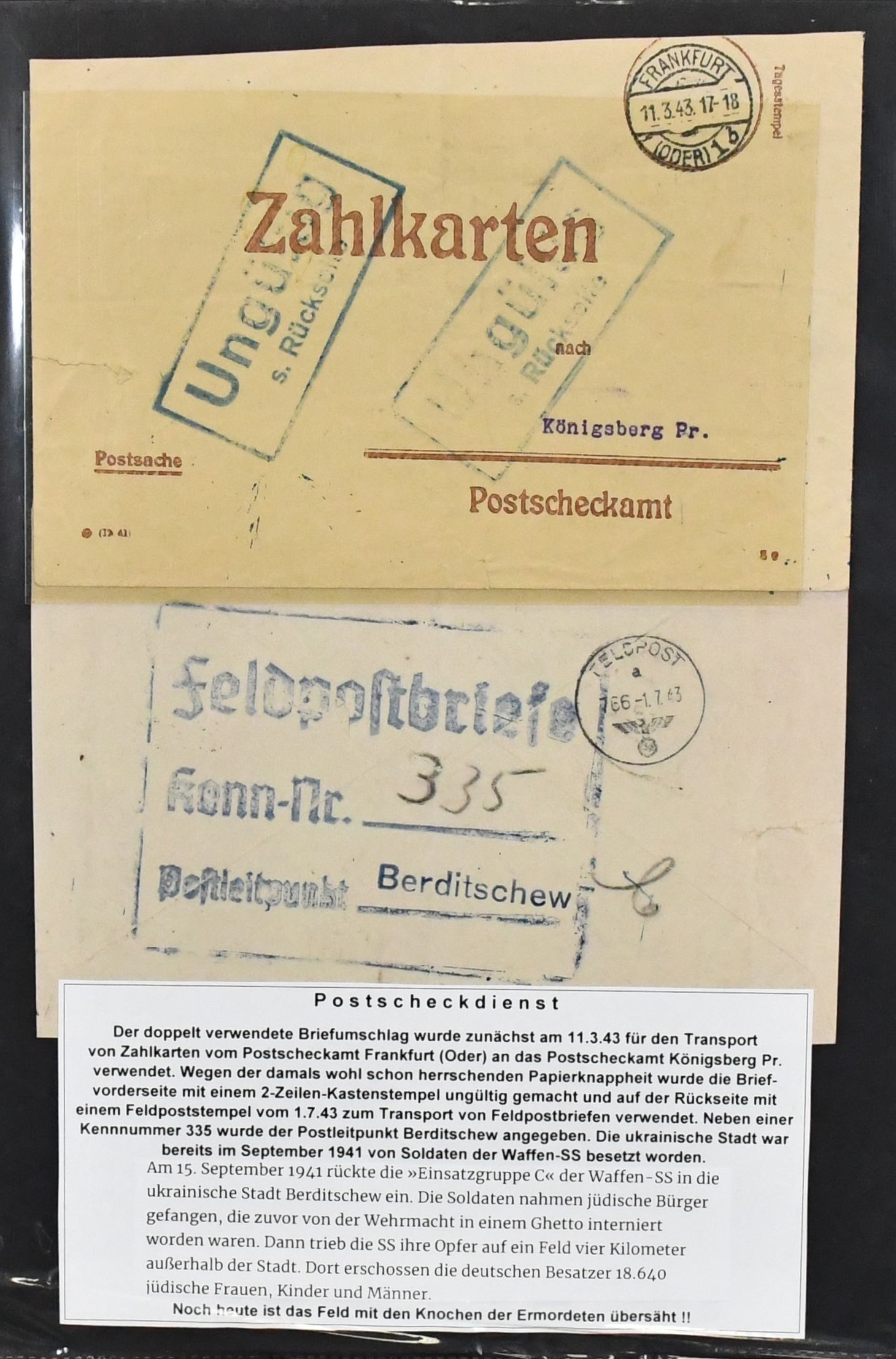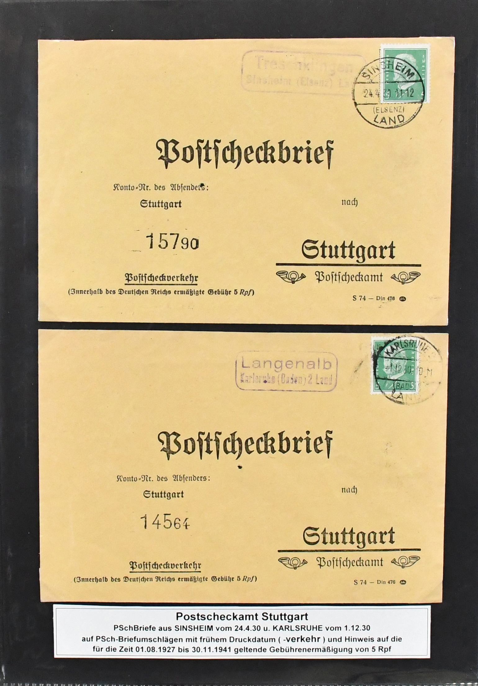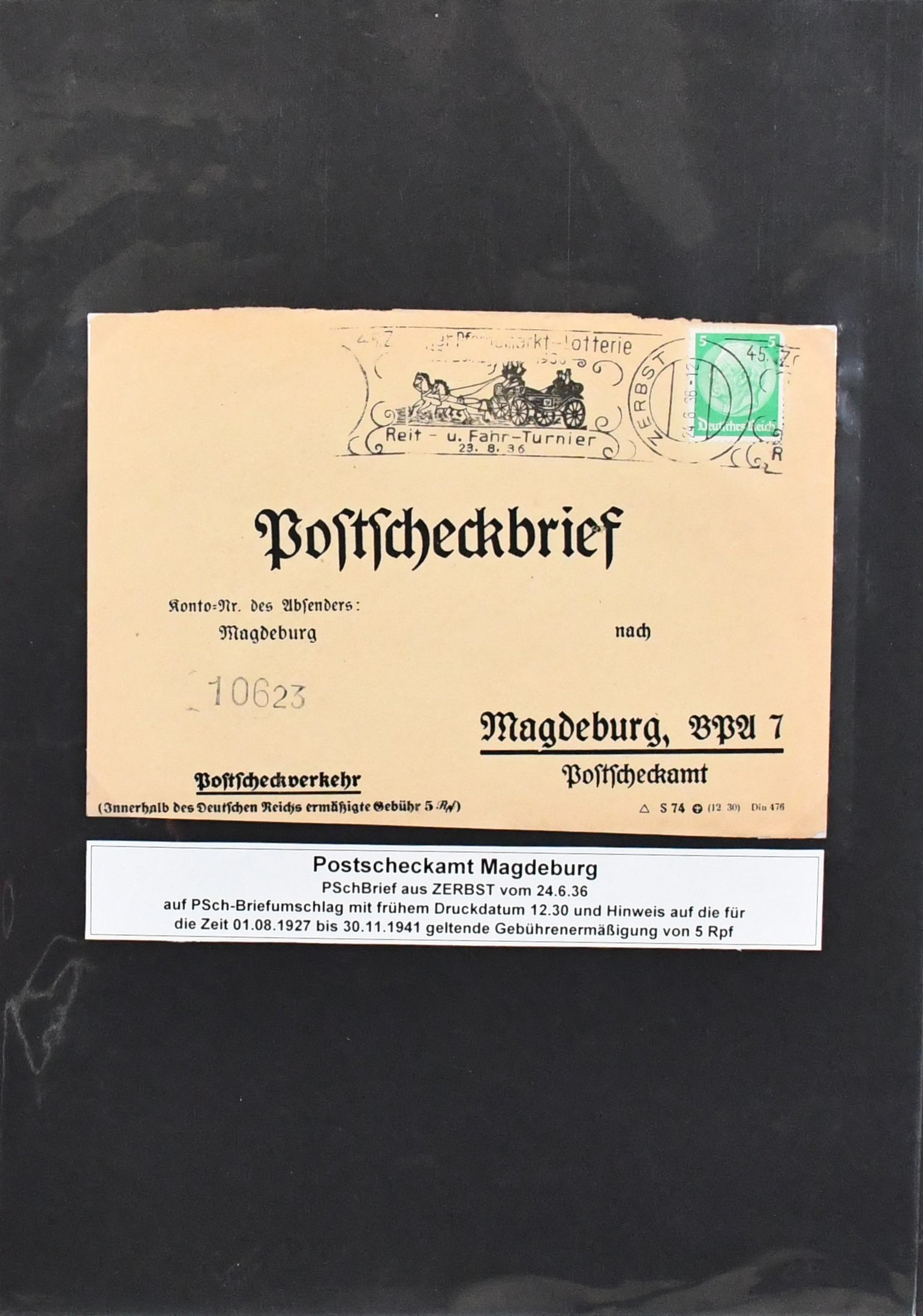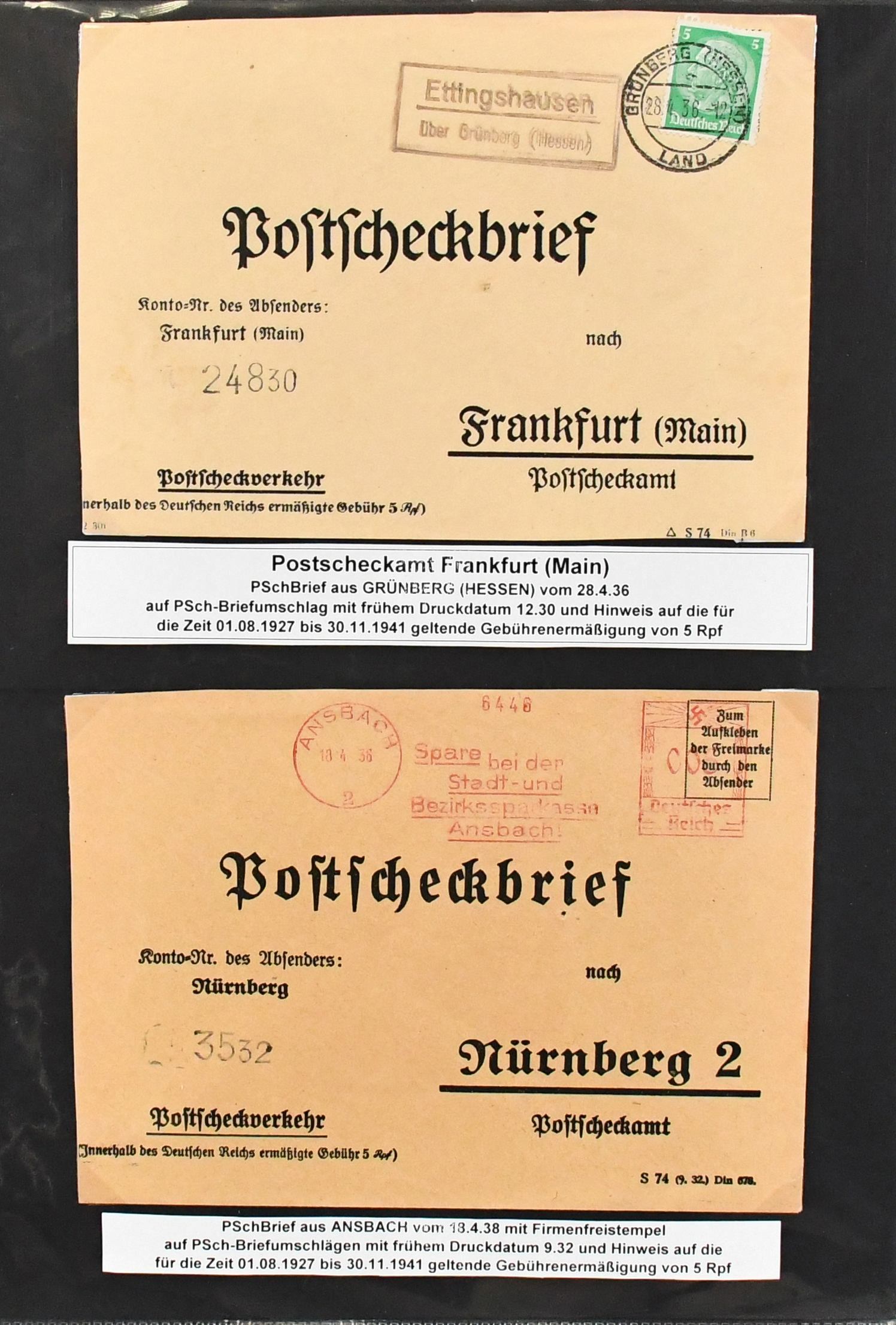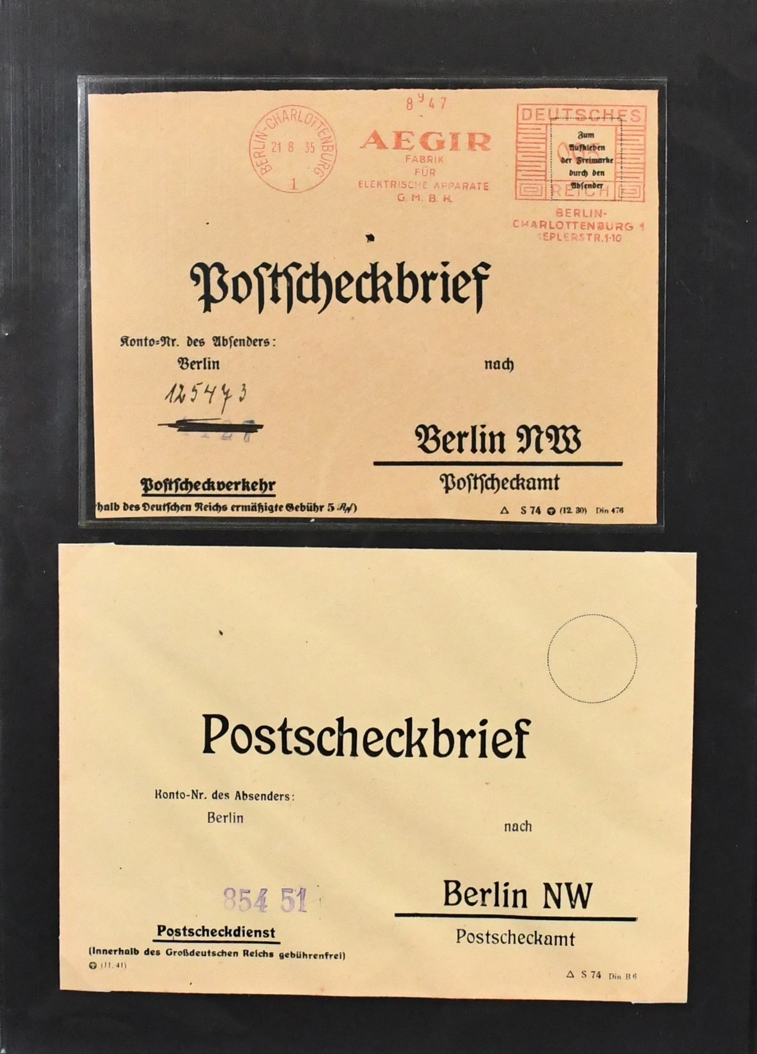III. Reich, Postscheck-Vordruckbriefe, Partie von 17 Belegen in untersch. Varianten, dabei Einzelfrankaturen 5 Pfg. (inkl. Hindenburg und Dienst Parteimarke), zwei seltene Vordrucke des Postscheckamtes Breslau usw.